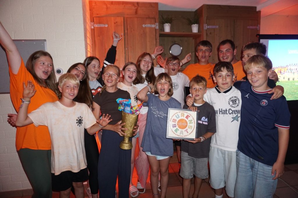 Wir blicken zusammen auf die letzten Tage zurück, schauen uns Fotos an und singen unsere Lieblingslieder. Wir haben seit Jahren das erste Mal wieder eine Lagergemeinschaft gehabt, die so lautstark und gerne gesungen hat! Das war wirklich schön! Dann gibt es die Siegerehrung der Gruppe, die in der Woche die meisten Punkte sammeln und durch das Abschlussspiel noch verbessern konnten. Herzlichen Glückwunsch Gruppe A!